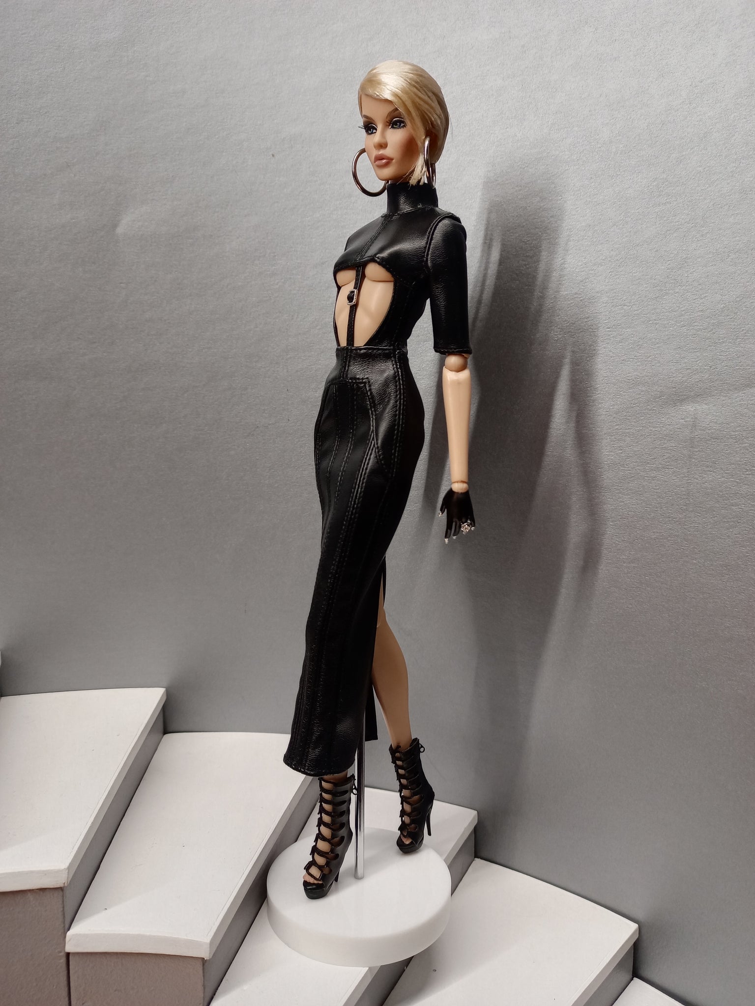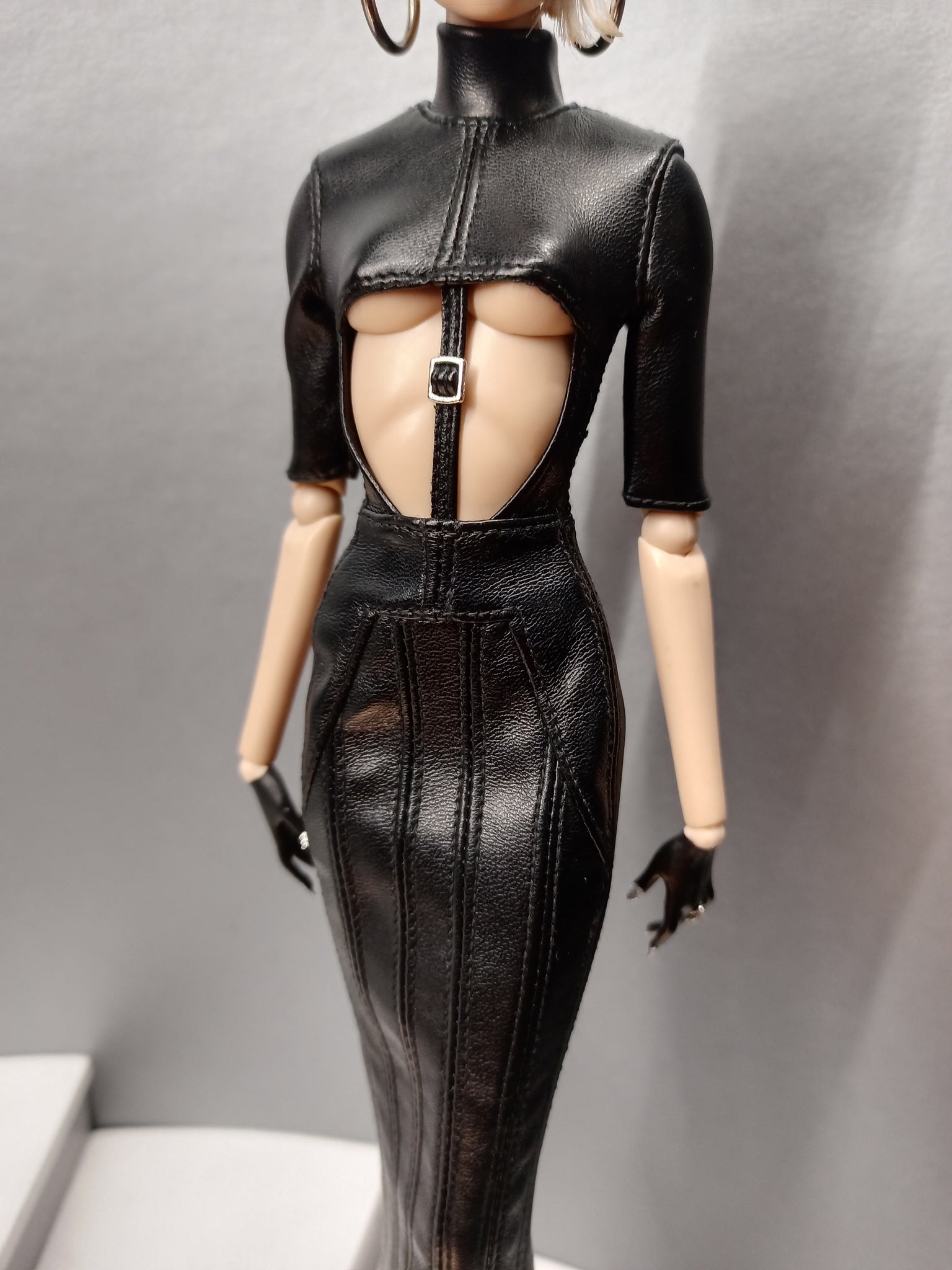 Closes at the back with zipper. Made in stretch faux leather. You can choose the different hardware color for ultimate costumization.